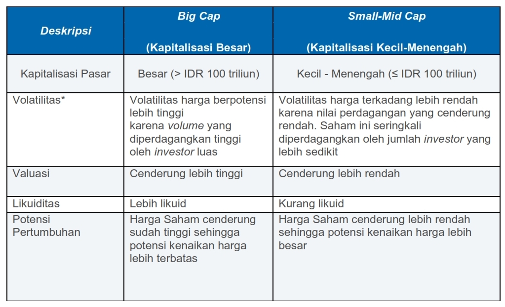Berdasarkan kapitalisasi pasar, Saham dapat dibedakan menjadi: